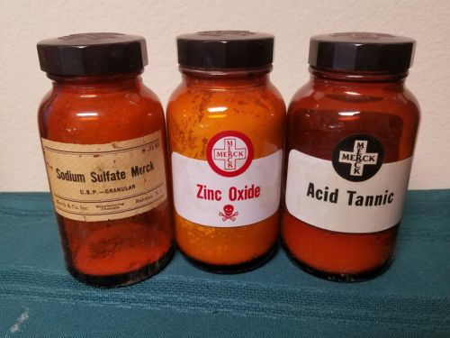 Title (ebay affiliate link): Lot of 3 Vintage Merck Apothecary Bottles Amber w/ Label Bakelite Caps