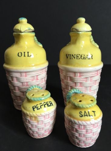 Title (ebay affiliate link): Vintage Salt,Pepper,Oil and Vinegar Set. Pink Basket Weave (Relco, Japan?)