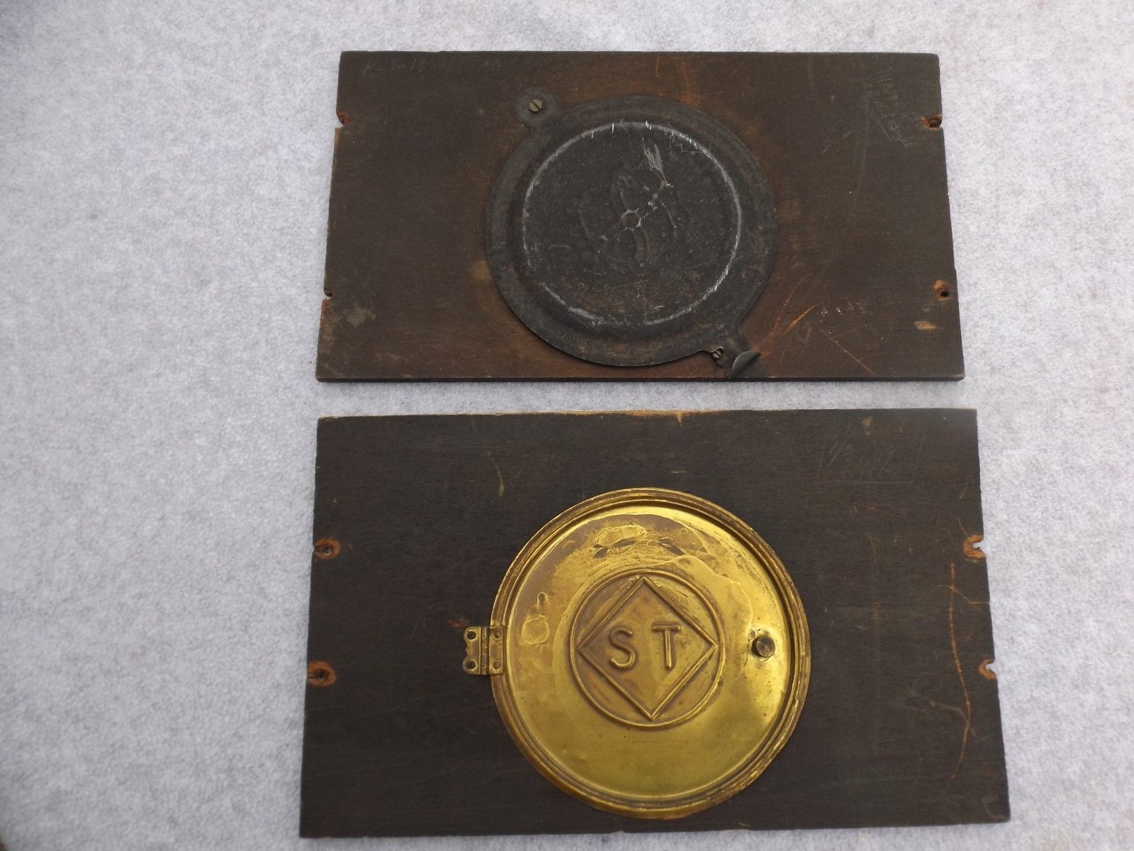 2 OLD ANTIQUE SETH THOMAS MANTLE SHELF METAL BACK DOOR & BACK BOARD CLOCK PARTS