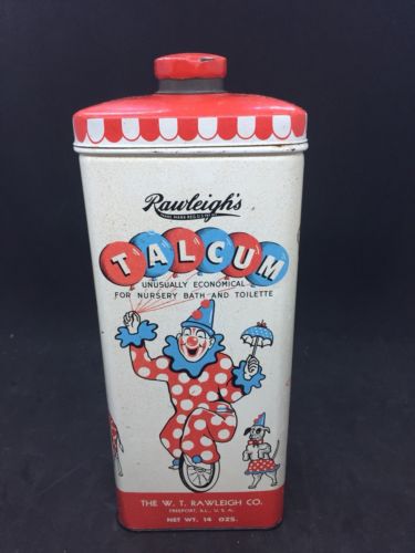 Title (ebay affiliate link): Vintage Rawleigh''s Talcum Powder Tin ~ Clown/Circus Graphics ~~ Nursery