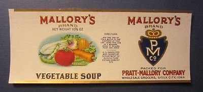 Title (ebay affiliate link): Old 1927 Mallory''s - Vegetable Soup - CAN LABEL - Pratt-Mallory Sioux City IOWA
