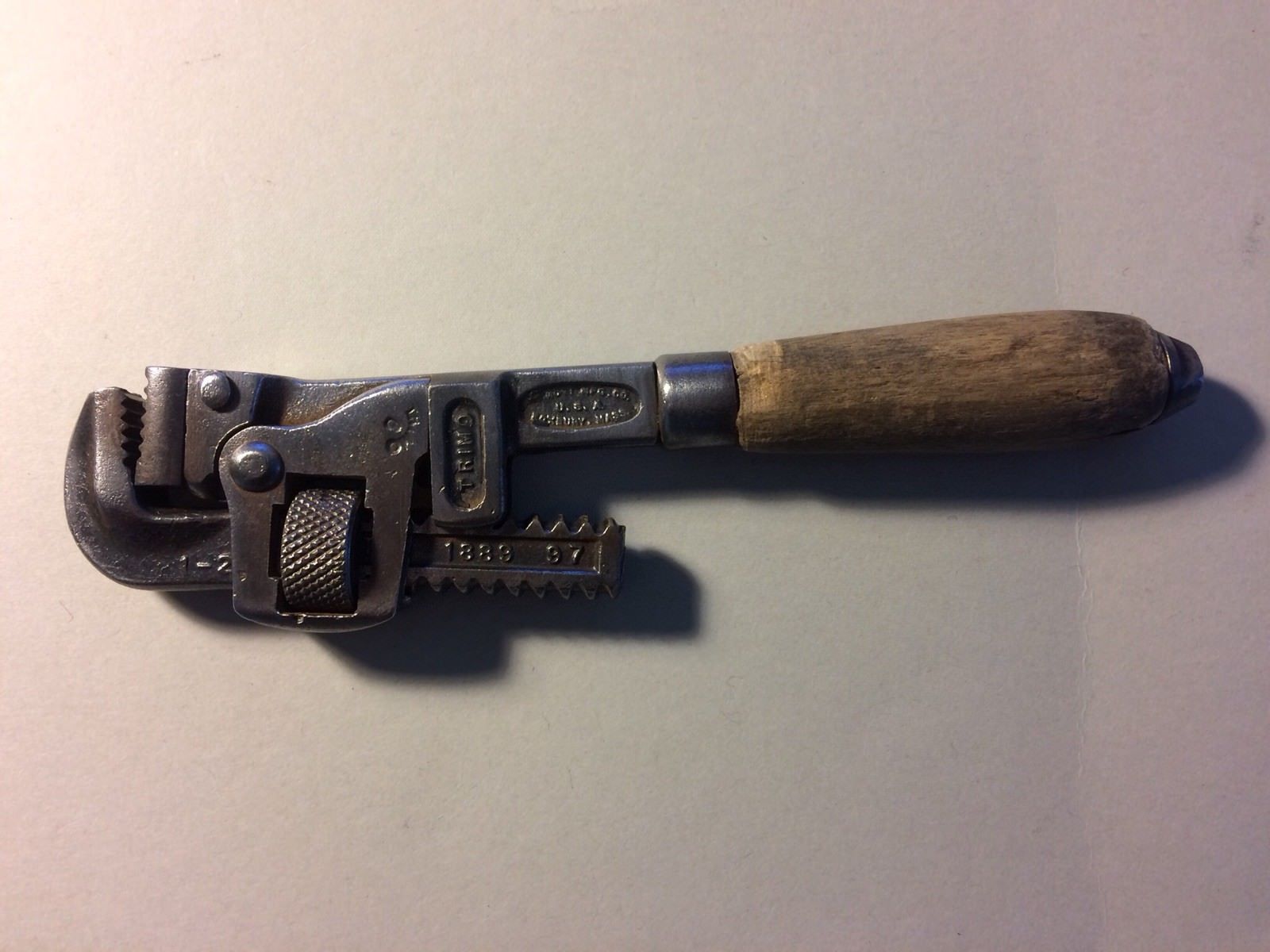 USED VINTAGE PAT D 1889 TRIMO PIPE WRENCH WOODEN HANDLE