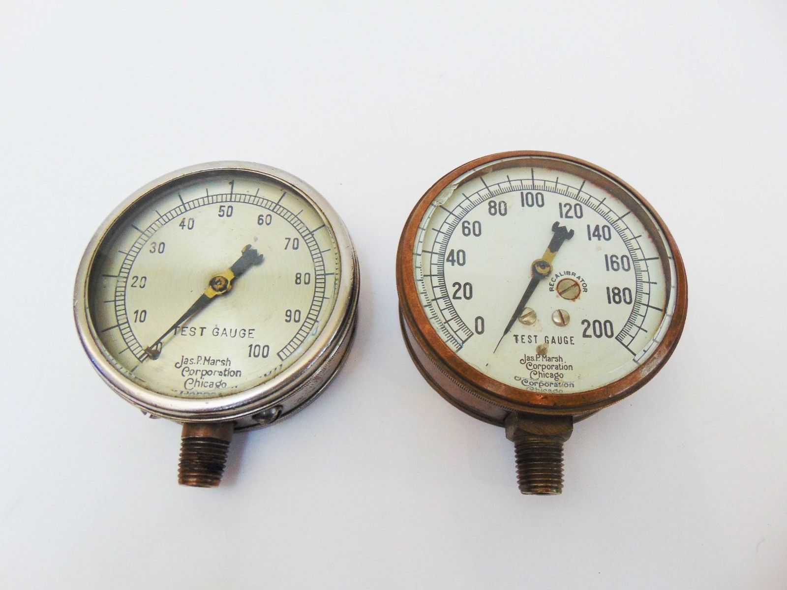 Title (ebay affiliate link): 2 Antique Brass Pressure Test Gauges, Jas.P.Marsh Chicago, Plumbing, Steampunk