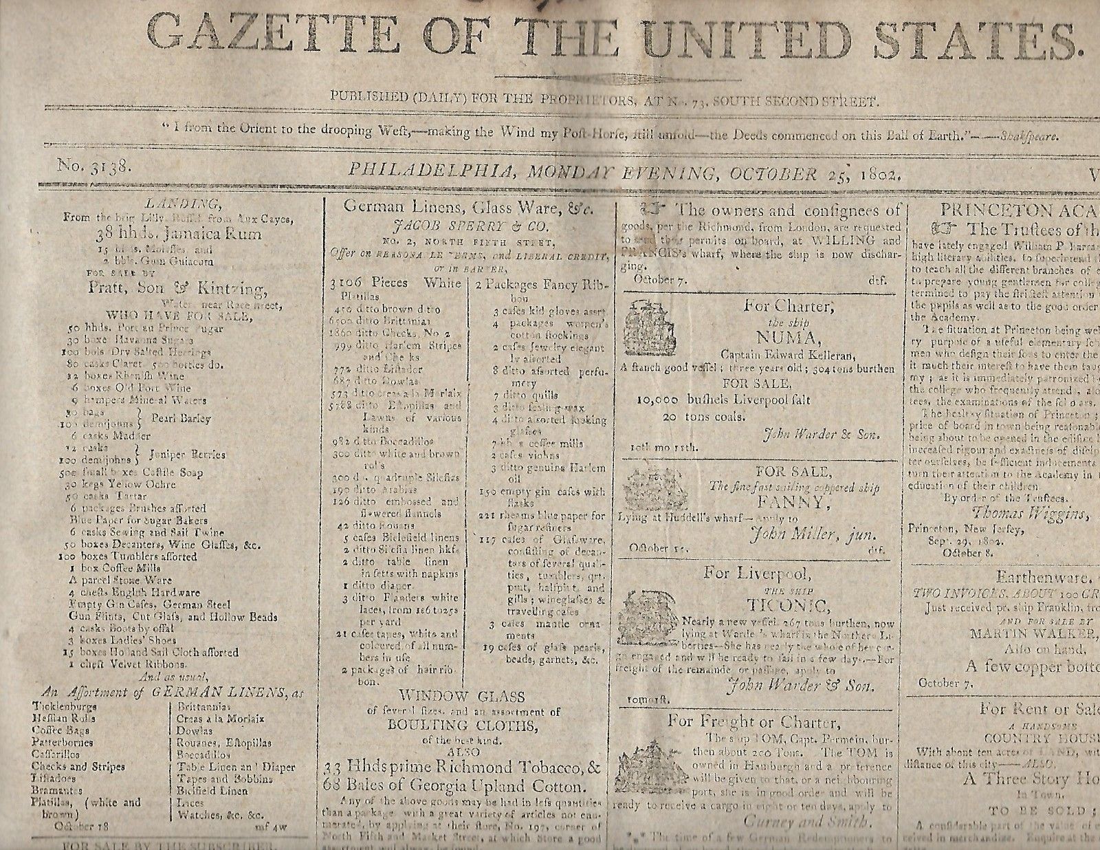 Orig. 19th paper "GAZETTE OF THE UNITED STATES" Philadelphia October 25, 1802