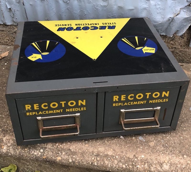 Title (ebay affiliate link): Antique 1950s Recoton Needles Display Metal Industrial Parts Bin Cabinet Sign
