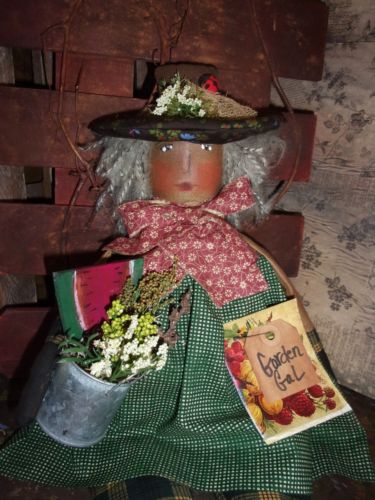 Title (ebay affiliate link): *Primitive 17x7in GARDEN GAL GREEN DRESS CAN Stuffed Country old rusty doll*