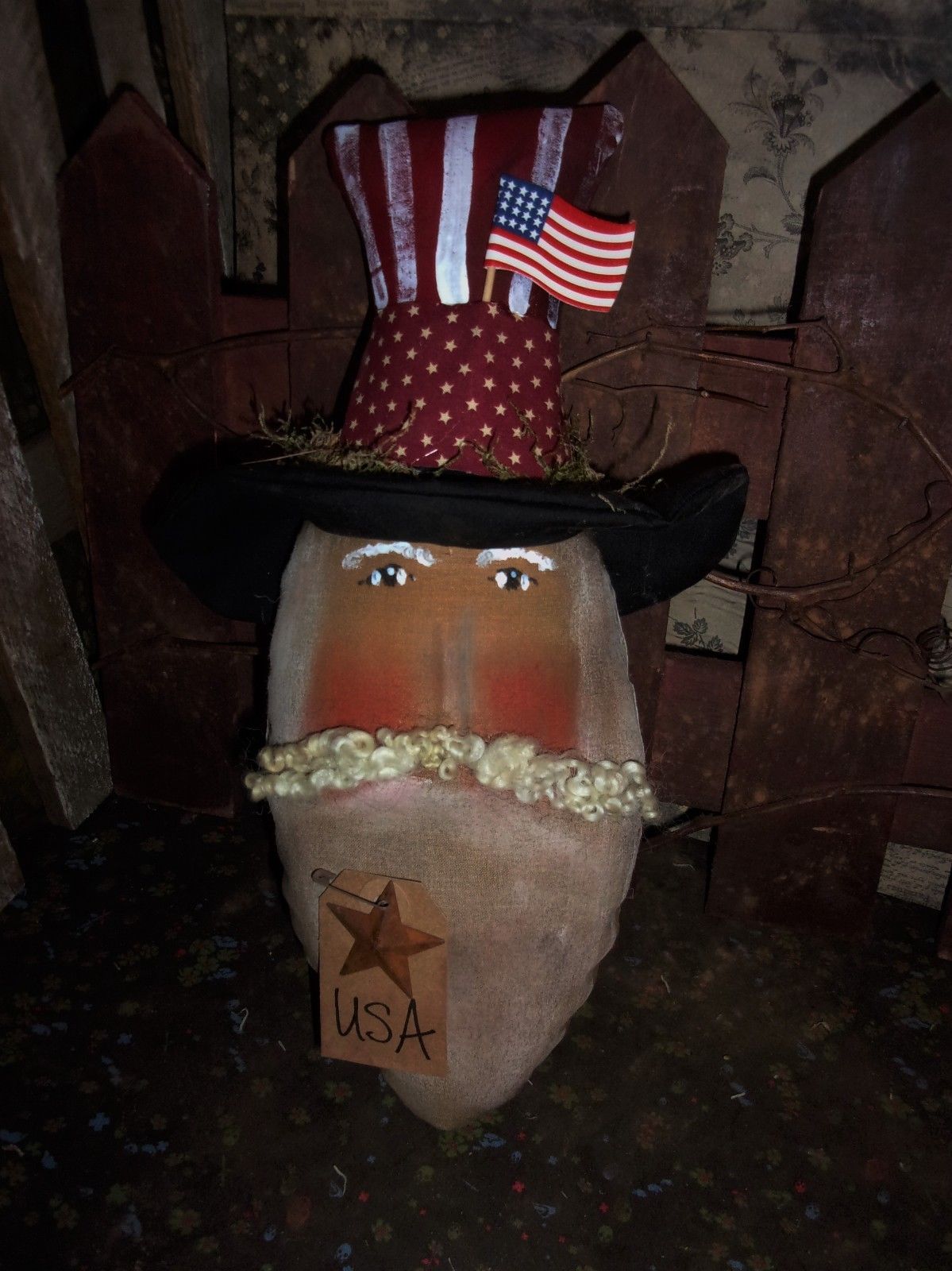 Title (ebay affiliate link): *Primitive 13x8in LARGE UNCLE SAM HEAD ONLY Stuffed Country old rusty doll*