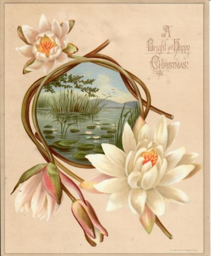 Title (ebay affiliate link): Water Lilies on Pond, and intertwining a Frame. 1887 Louis Prang Xmas Card.
