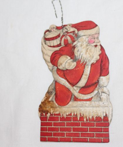 Title (ebay affiliate link): Santa climbing into Chimney, with Mica. Early 1900s Heavier Paper Xmas Ornament