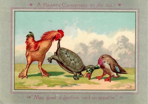 Rooster attacking Turtle while Turtle attacks Goose. 1883 Louis Prang Xmas Card.