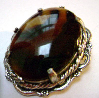 Title (ebay affiliate link): Antique Ornate Cabushon Brooch Rare Stone Tigers Eye?