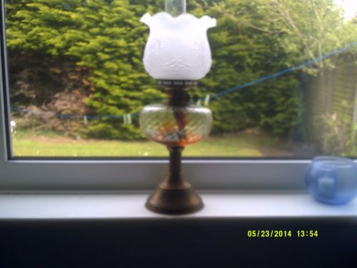 Title (ebay affiliate link): Vintage brass oil lamp with a frosted fluted shade