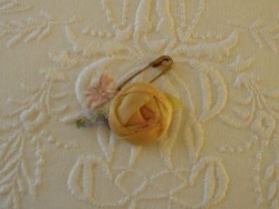 Title (ebay affiliate link): TINY VNTG FRENCH SILK ROSEBUD WITH PIN "DOLLS LINGERIE"