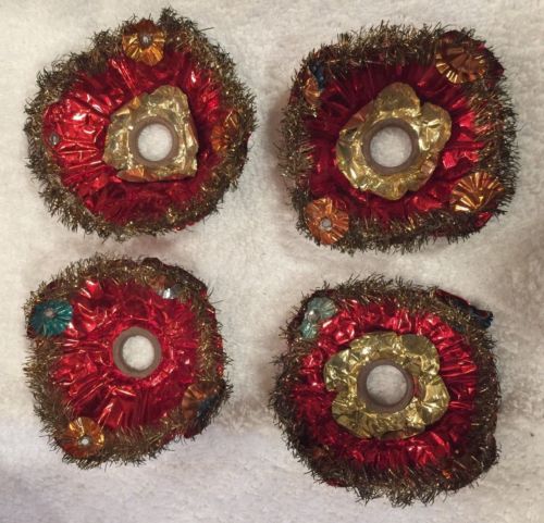Title (ebay affiliate link): 4 antique vintage christmas foil & tinsel light reflectors - red orange gold