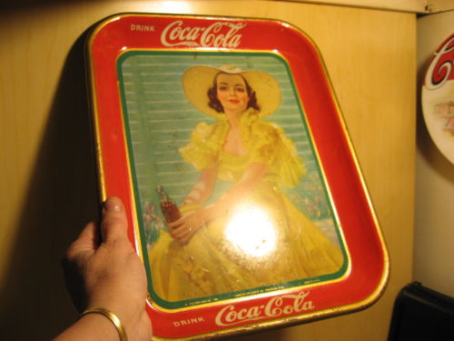 Title (ebay affiliate link): ANTIQUE ORIGINAL COCA COLA TRAY GIRL IN YELLOW DRESS 1938 AMERICAN ART WORKS