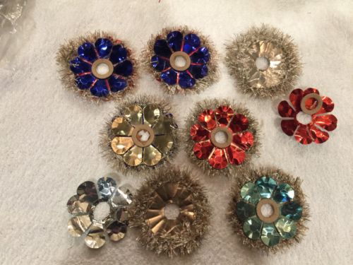 Title (ebay affiliate link): 7 antique vintage christmas foil tinsel reflectors-red blue silver gold on white