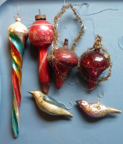 Title (ebay affiliate link): 6 antique Mercury Glass ornaments: Birds, Wire mesh deep red teardrop, spiral +