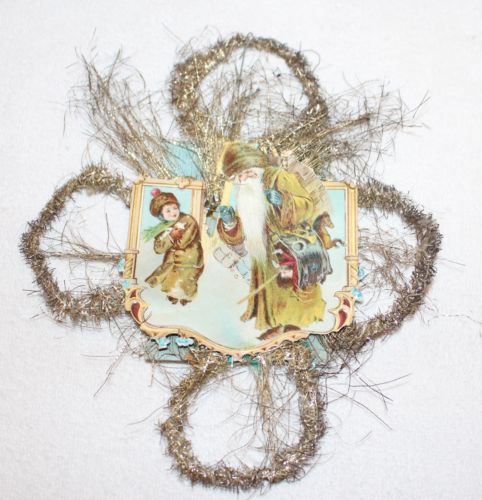 Title (ebay affiliate link): Brown suited Santa, with Boy. Larger Paper & Tinsel early 1900s German Ornament.
