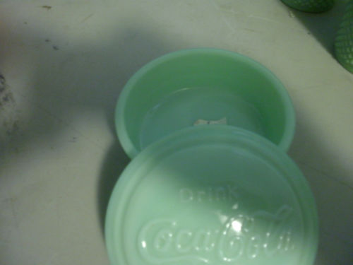 Title (ebay affiliate link): Jadeite Coca Cola Coke Bowl & Lid Candy Dish $ 4 GLASSES