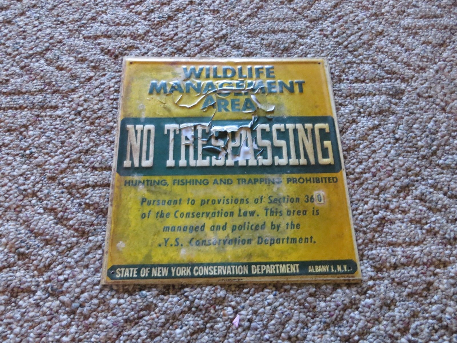 Title (ebay affiliate link): Wildlife Management Area,No Trespassing, NY Conservation Dept.Albany 1,N.Y. SIGN