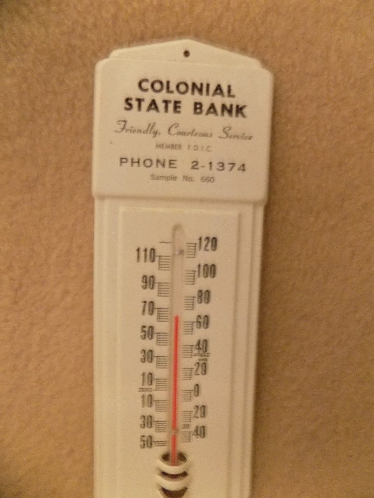 VINTAGE SALESMAN SAMPLE BANK ADVERTISING METAL WEATHER THERMOMETER PHONE 2-1374