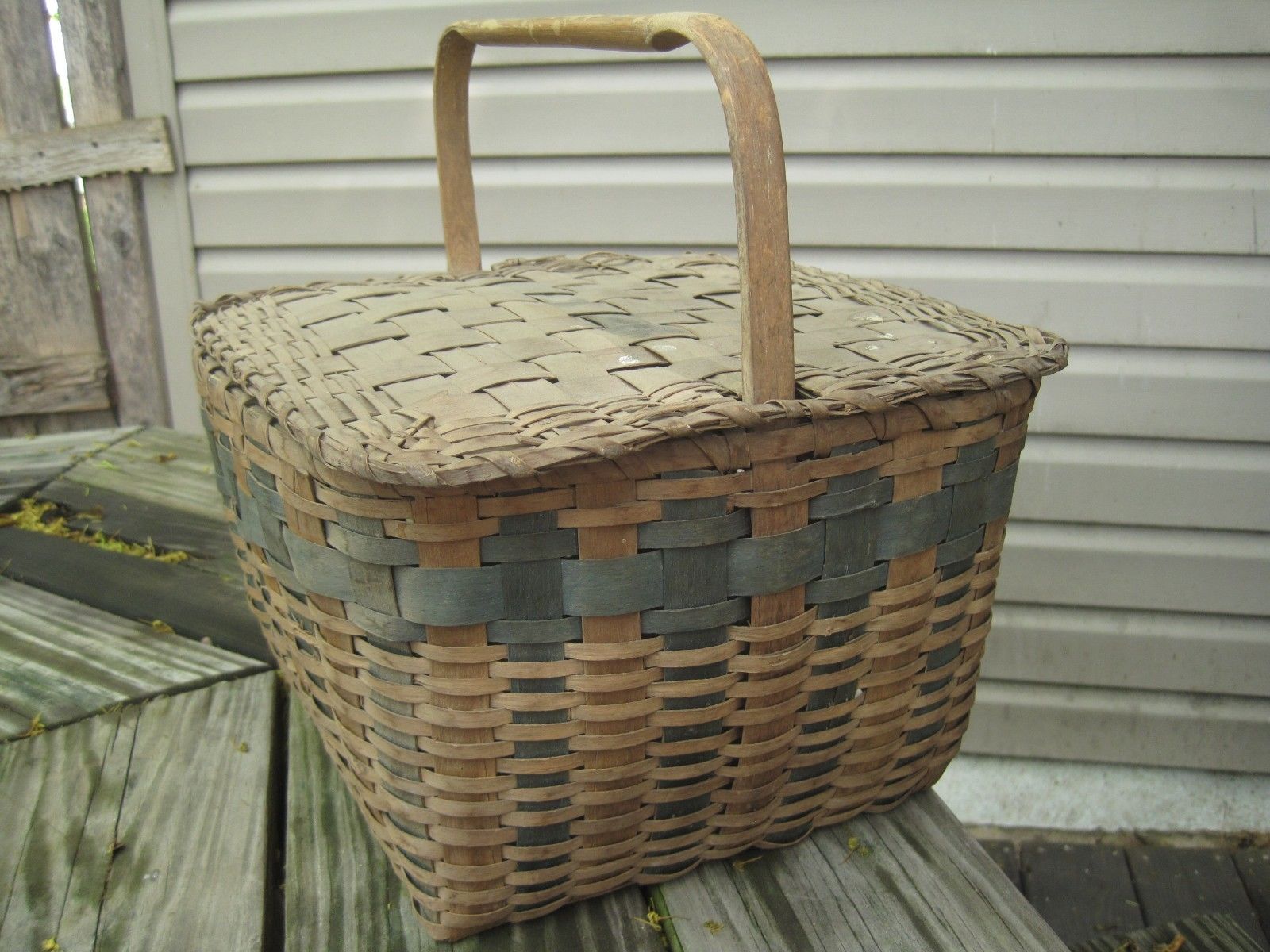 Title (ebay affiliate link): Antique Blue Dyed splint Feather Basket w lid,Carved Handle, Penobscot