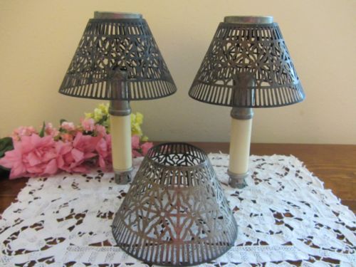 Title (ebay affiliate link): ANTIQUE PRIMITIVE 2 CANDLE STICK HOLDERS w/CHIMNEY AND 3 RETICULATED SHADES