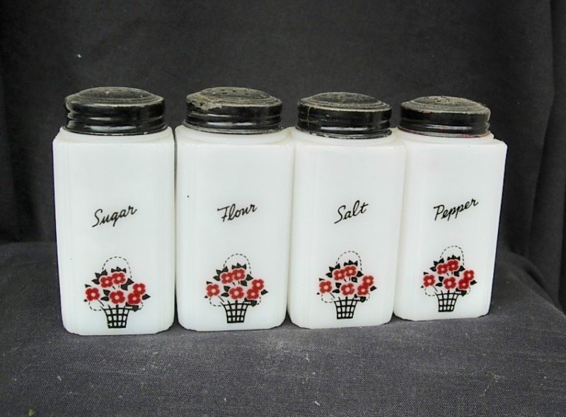 Title (ebay affiliate link): RED & BLK FLOWER BASKET 4 SHAKERS Milk Glass SALT*PEPPER*SUGAR*FLOUR