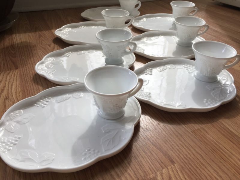 Title (ebay affiliate link): Colony Harvest Milk Glass Grape Vine, set of 7 Snack Luncheon Plate & Punch Cup