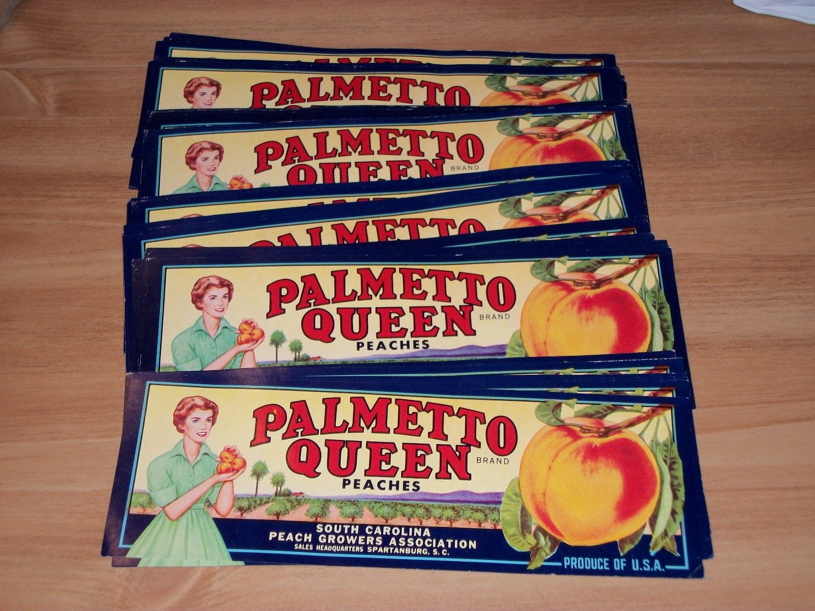 Title (ebay affiliate link): 25 Vintage Palmetto Queen Peach Labels Spartanburg SC Unused