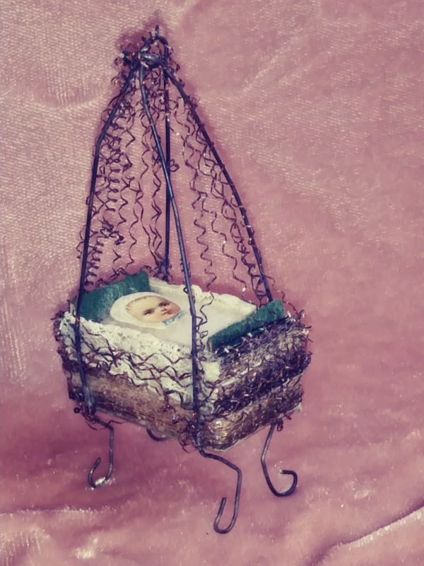 Vintage Die Cut Wire Wrapped Tinsel Baby Cradle Feather Tree Christmas Ornament