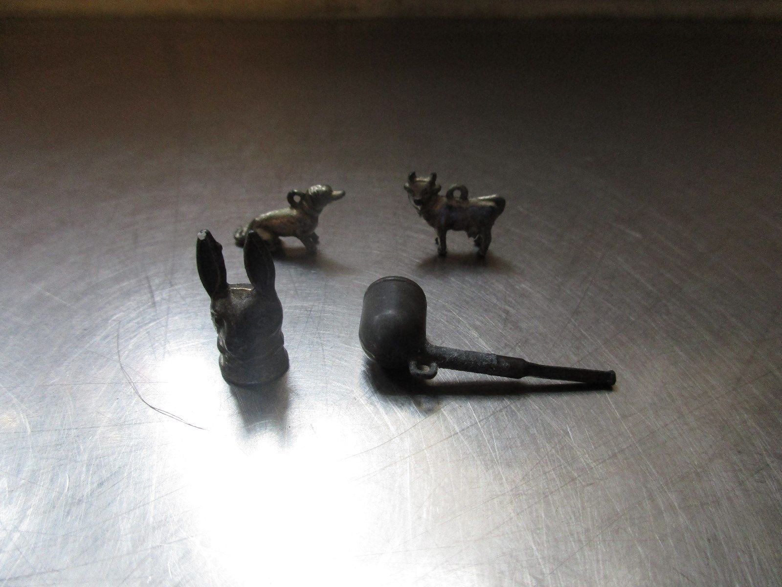 VINTAGE Metal Lot of 4 Rabbit, Pipe Charms Cracker Jack Toy Prize 1920''s-30''s