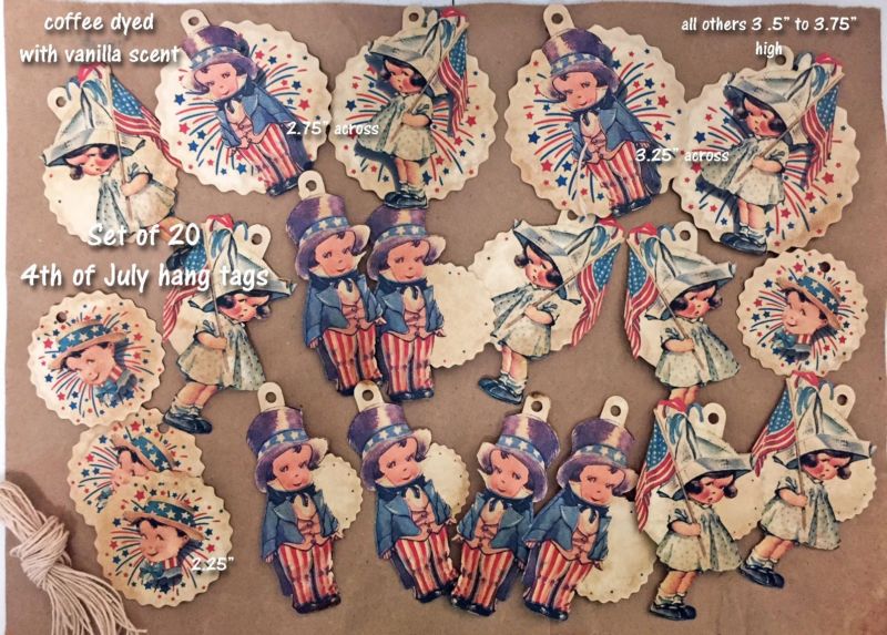 Title (ebay affiliate link): Set of 20 vintage-look 4TH OF JULY PATRIOTIC HANG TAGS primitive ornies