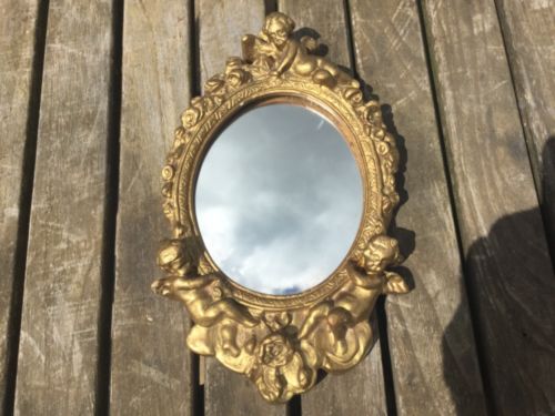 Title (ebay affiliate link): VICTORIAN GOLD PAINTED CHAULKWARE 3 CHERUB`S SMALL MIRROR 8.5" X 5.5"