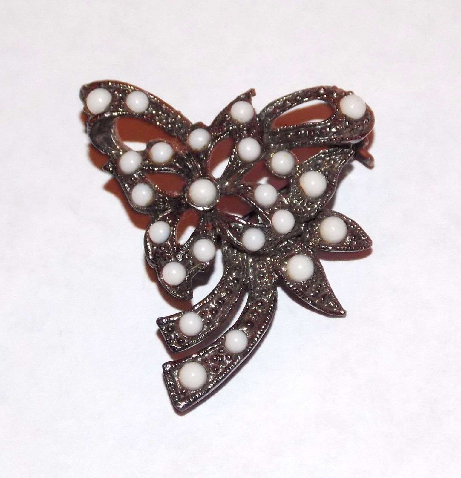Antique Finish Faux Marcasite Ribbon Bow Brooch Pin White Cabochon Unsigned