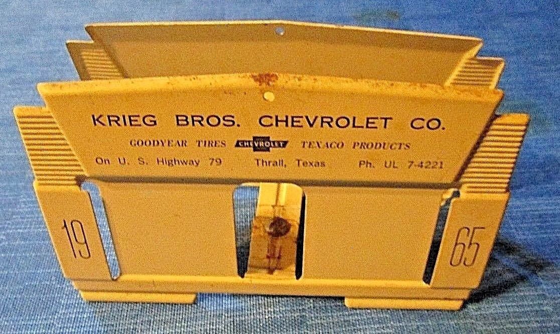 Title (ebay affiliate link): KREIG BROS. CHEVROLET, THRALL, TEXAS, 1965 CALENDAR HOLDER, METAL