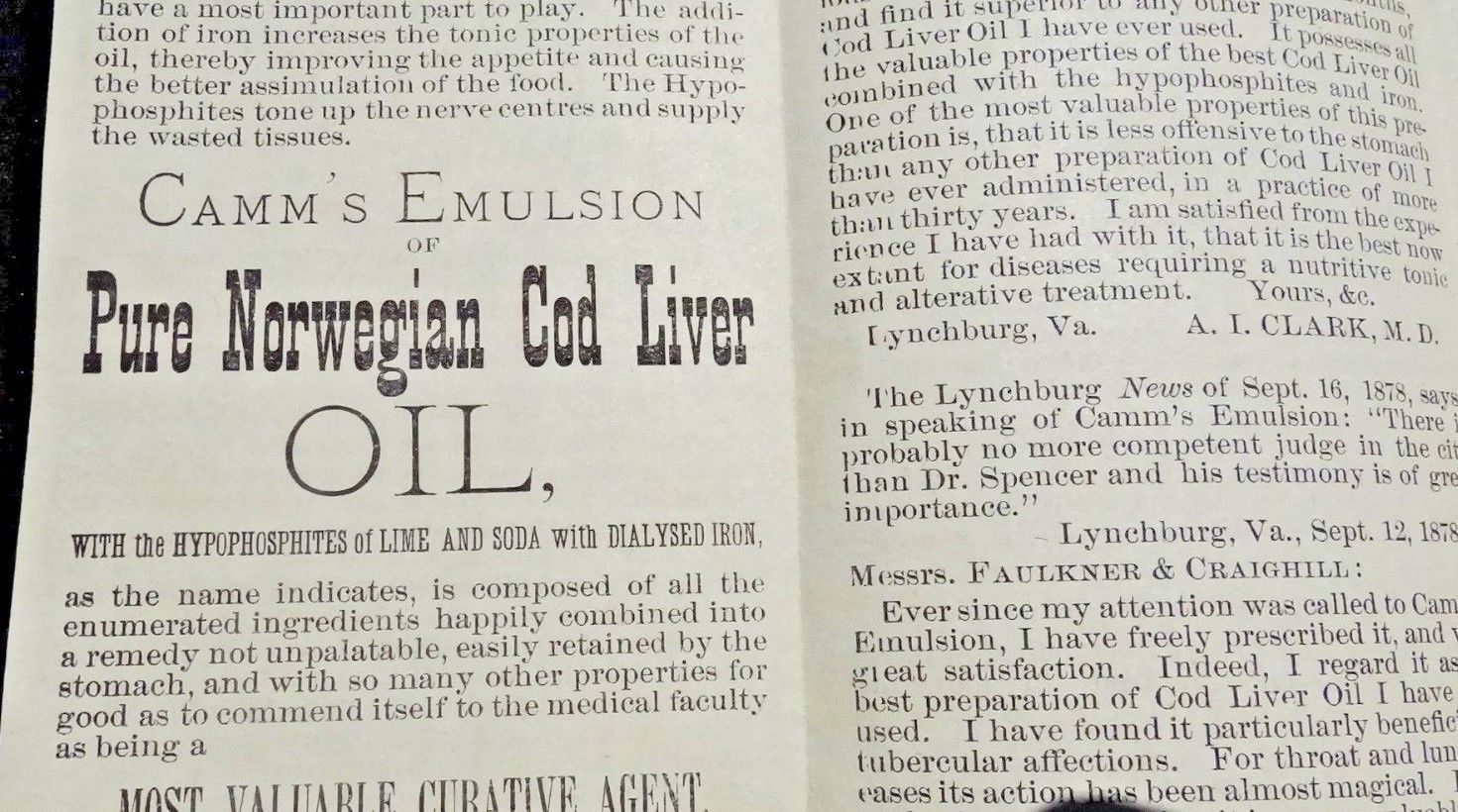 Title (ebay affiliate link): 1878 CAMM''S EMULSION COD LIVER OIL Quack Medicine Advertising LYNCHBURG, VA
