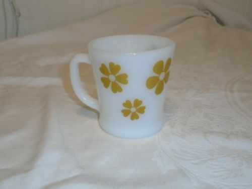 Title (ebay affiliate link): Vtg Retro Crazy Daisy Fire King Gold Flower Milk Glass Mug Mid Century Mod