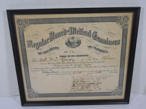 Title (ebay affiliate link): ANTIQUE 1906 REGULAR BOARD MEDICAL EXAMINERS LICENSE CERTIFICATE FLORIDA SEAL