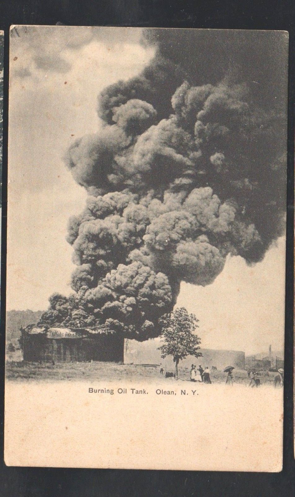 Olean, NY/ people in yard watching burning oil tank/ black & white postcard
