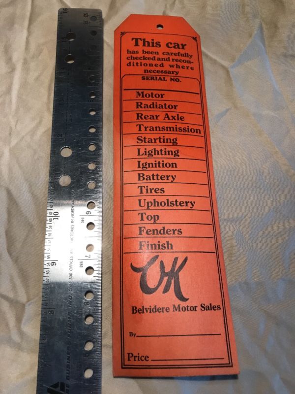 Title (ebay affiliate link): 1920 -1930 Chevrolet Ok Used Car Tag Belvidere (Illinois) Motor Sales.