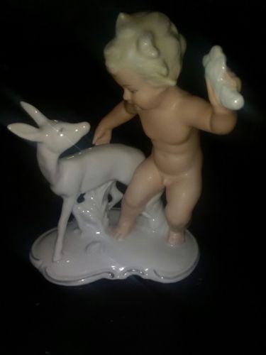 schaubach kunst Germany statue cherub & deer porcelain vintage Antique figurine
