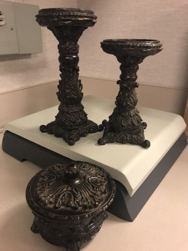 VINTAGE CREEPY CARVED CANDLESTICKS & 2 PC. MATCHING DISH