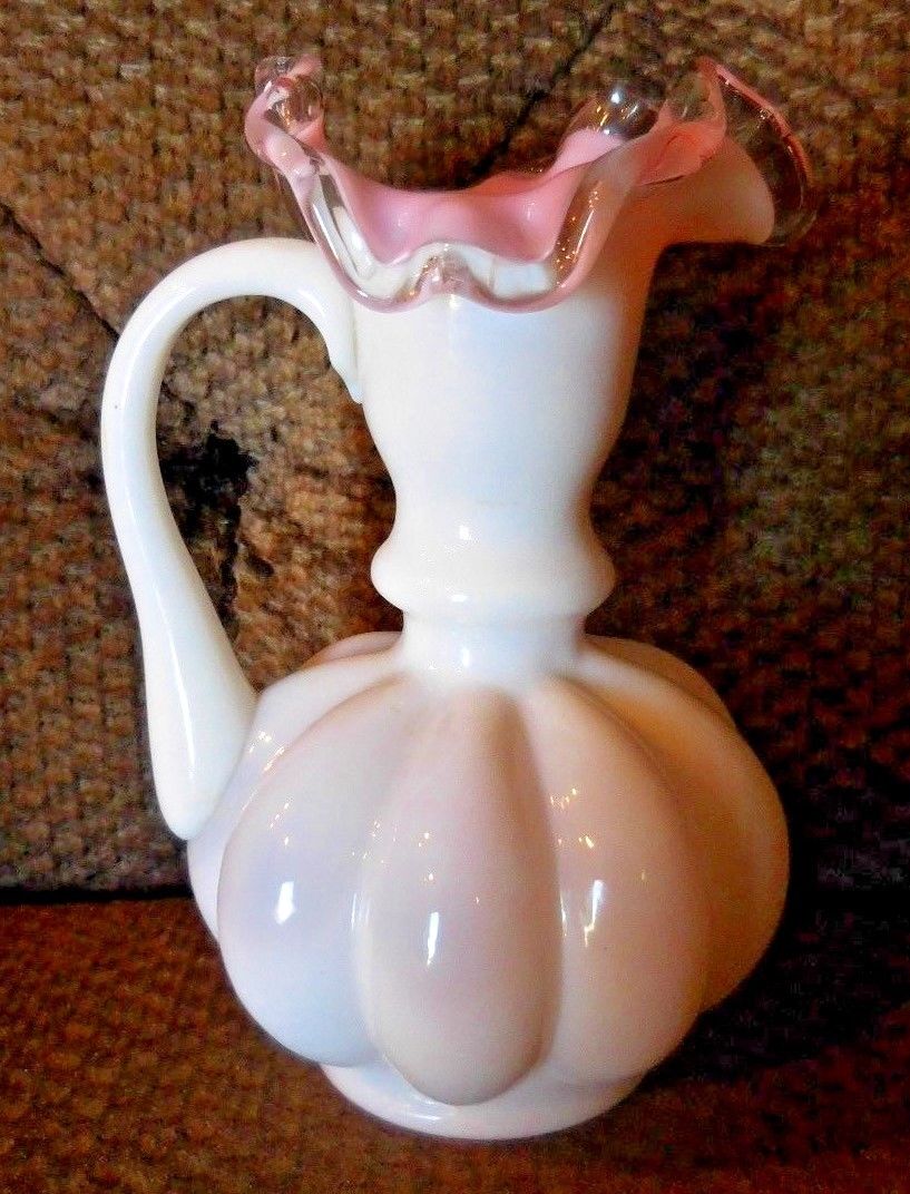Title (ebay affiliate link): Fenton Milk Glass White & Pink Ruffled Vase with Handle 6 3/4'''' High