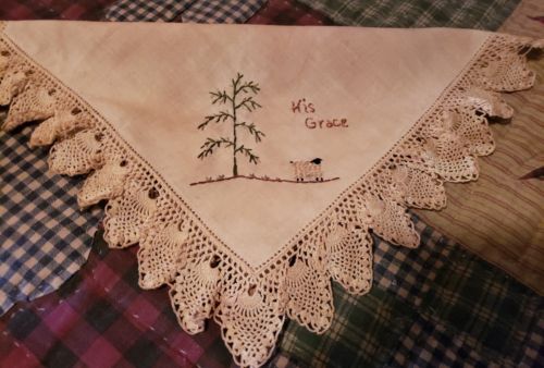 Title (ebay affiliate link): ~*Awesome~* Primitive "His Grace w/ Sheep" Hand Stitched Doily! Oh My!