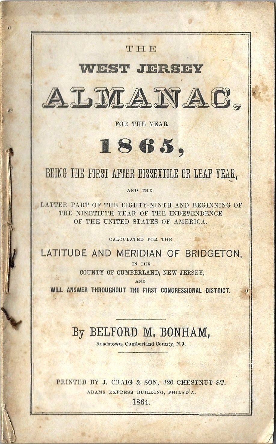 Civil War Era~1865 West Jersey Almanac~Bridgeton~Cumberland County NJ~BM Bonham