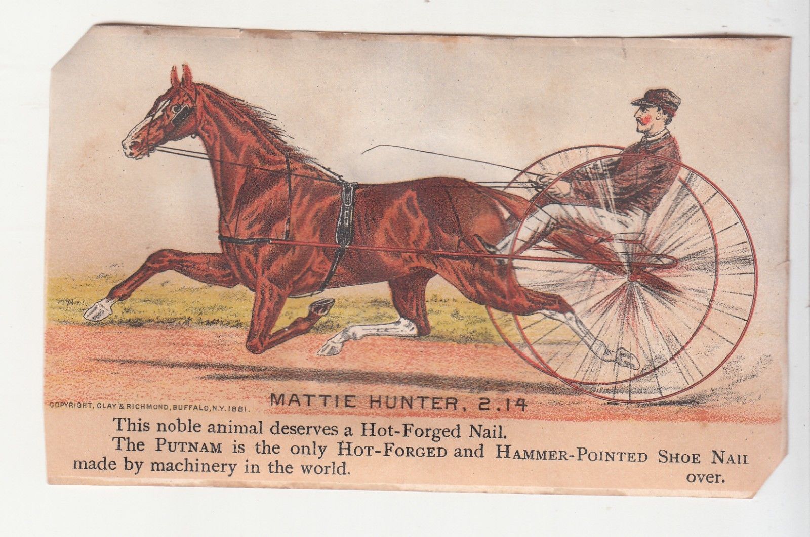 Title (ebay affiliate link): Putnam Nail Co Boston MATTIE HUNTER Trotter Horse Neponset MA Vict Card c1880s