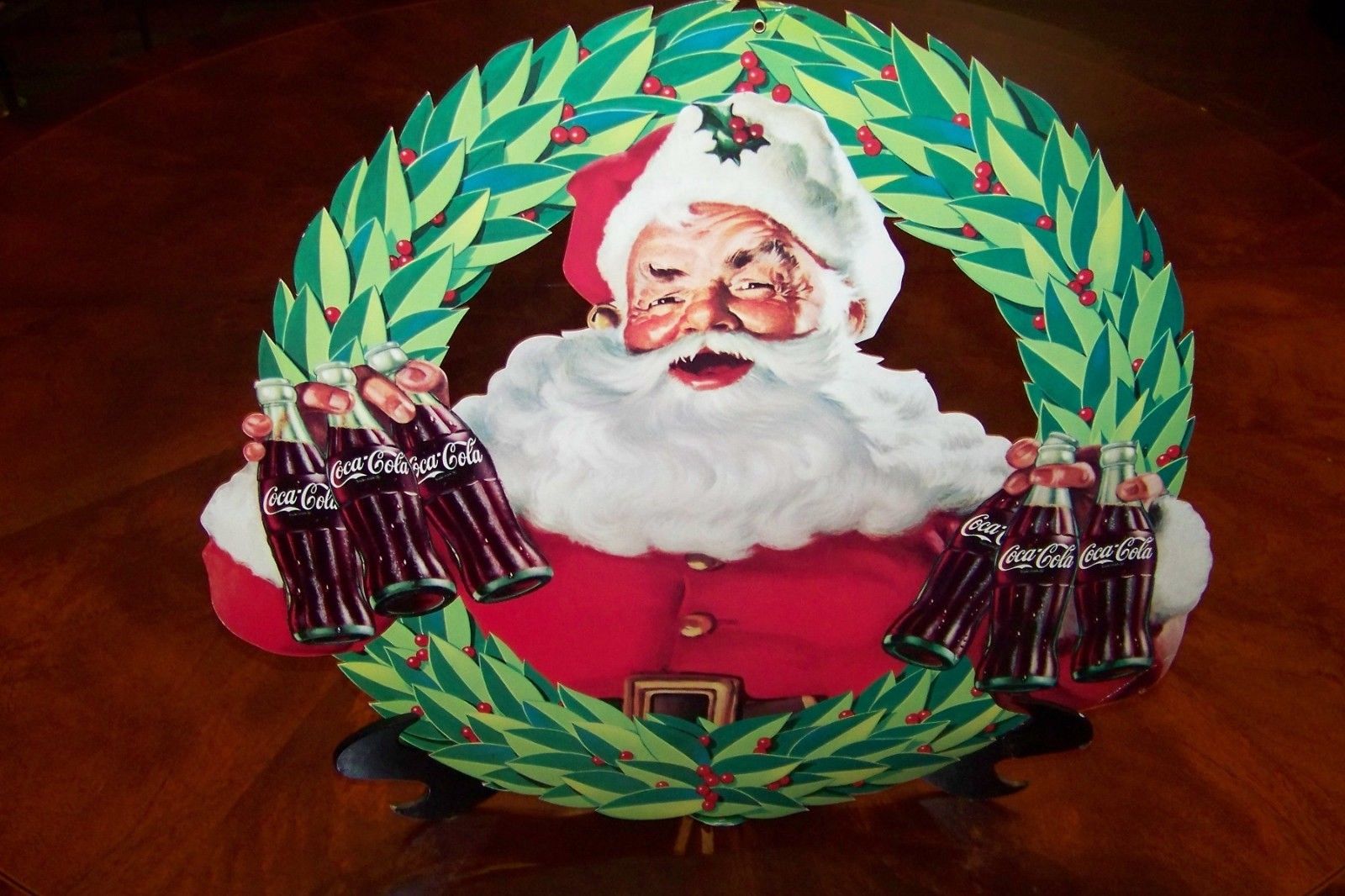 Title (ebay affiliate link): Vintage Coca Cola Advertising Hanging Sign Santa Claus & Christmas Wreath