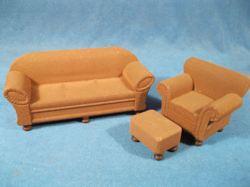 Vintage, Antique Strombecker Dollhouse Furniture, Sofa, Chair, Ottoman, Brown