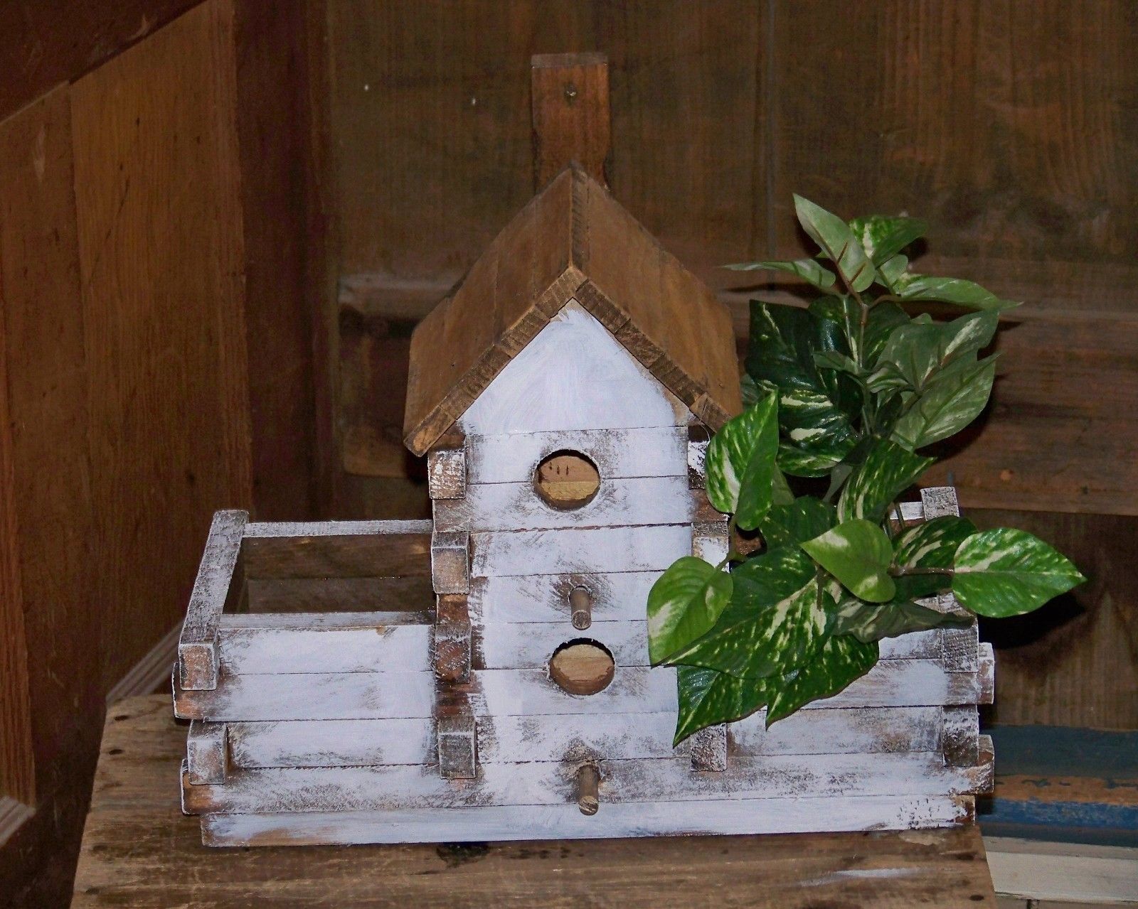 Title (ebay affiliate link): Primitive Lg Vintage Wood Bird House with Side Planters Handcrafted in Maine